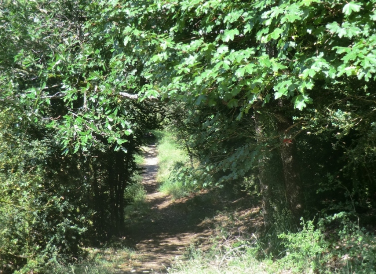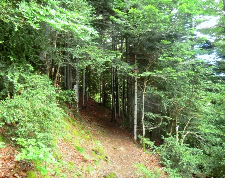 El ascenso es ahora un poco mayor, aunque pronto se suaviza. La senda discurre por un frondoso bosque en el que abundan robles, arces y serbales junto con pinos y abetos, el boj cubre gran parte del sotobosque. En muchos tramos del camino la luz del sol no alcanza el suelo y todo queda envuelto en la penumbra. Un arroyo cruza el camino sembrado de grandes piedras con una generosa cubierta de musgo con las que hay que tener cuidado, la humedad las vuelto resbaladizas.