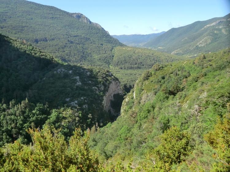 En algún momento la pendiente a nuestra derecha es considerable, mas el bosque es tan denso que alivia cualquier sensación de vacío. Ahora podemos ver la torre de Lo Vixía de frente desde el otro lado del valle, impresiona la profundidad y el verdor el mismo. En el trayecto de ida hemos ido viendo el barranco de La Pinosa, una estrecha garganta que desciende en el lado de enfrente, por el que ahora discurrimos, y que el sendero cruza por su parte superior, si nos asomamos veremos desde arriba la impresionante pared que lo flanquea. Este es el punto más alto del recorrido 1.195 metros.