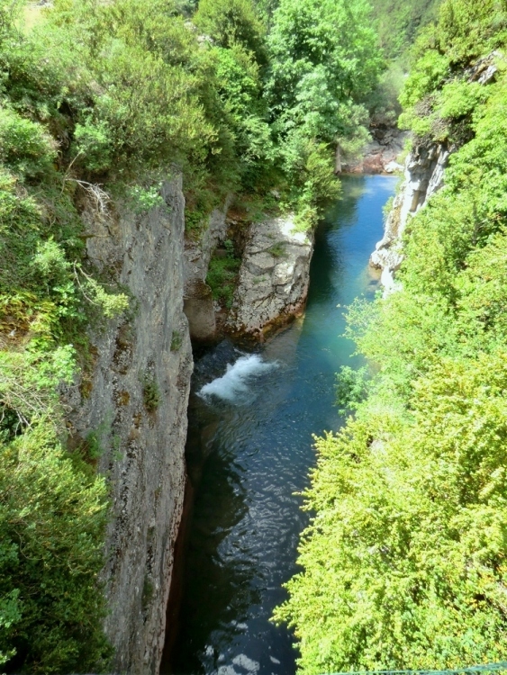 Río Aragón Subordan desde el puente de Santa Ana, encajonado entre paredes calizas, a la izquierda la surgencia de la cueva y fuente Santa Ana.