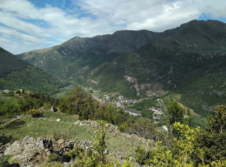 Divisamos muchos kilómetros de valle, a la izquierda en dirección SO Barruera, unos 300 metros bajo de nosotros, a vista de pájaro, más allá el pequeño pueblo de Cadret en mitad de la ladera. Enfrente el valle que desciende desde el Port de la Gelada. A la derecha Boí, en la margen izquierda del Noguera de Tor, nuestro próximo destino, enfrente suyo, en la margen derecha Erill la Vall. La uniformidad, en parte exigida, de las construcciones con paredes de piedra y tejados de pizarra negra contrastan con el verdor del valle que los envuelve. En todos ellos se aprecian los campanarios de sus ermitas románicas, uno de los atractivos del valle. En la cabecera del valle, Caldes de Boí y, aunque no se llega a ver, la presa del Embalse de Cavallers.