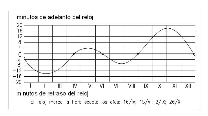 | Figura 2: La curva conocida como ecuación de tiempo marca la diferencia entre la hora señalada por el reloj de sol y la hora civil para ese lugar. |