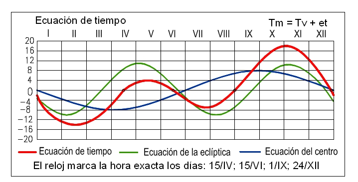 El tiempo transcurrido entre dos culminaciones sucesivas del sol no se corresponde con las 24 horas que dura el día civil. Unos días solares duran más de 24 horas y otros menos. La diferencia entre la hora solar verdadera señalada por el reloj de sol y la hora solar media se denomina Ecuación de Tiempo.