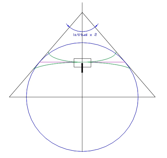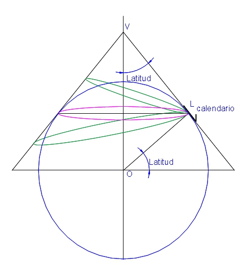 Si el calendario es tangente a la superficie esférica de la Tierra, la perpendicular en dicho punto formará un ángulo con el ecuador en “O” igual a la latitud del lugar, y dado que los ángulos de un triángulo suman 180º, si en el triángulo “VOL” el ángulo en O es la colatitud del lugar el ángulo en V será la latitud del lugar. La intersección del plano correspondiente a la luz solar que pasa por el extremo del gnomon, al cortar el cono forma curvas cónicas y, puesto que son curvas cerradas serán elípticas. En el caso de que el plano de la luz sea paralelo al ecuador al cortar el cono engendrado por el giro produce un círculo.