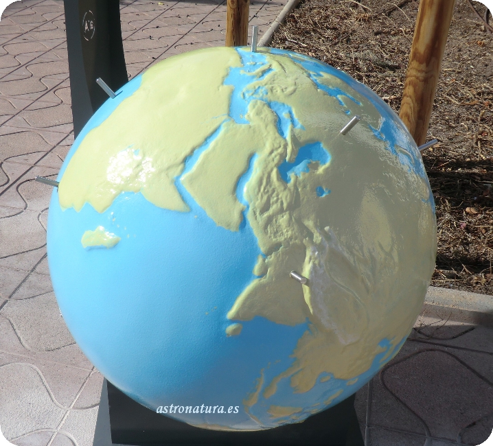 Seguro que has visto otras muchas esferas que representan el globo terrestre, en apariencia la que estás contemplando no difiere demasiado, además del tamaño, lo que es poco habitual es su orientación. Esta esfera esta orientada con su polo norte hacia el norte geográfico y con la misma inclinación que la latitud de Albuixech.
