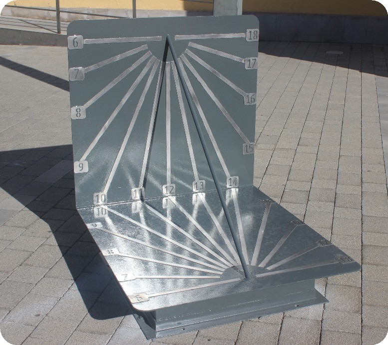 El panel vertical es muy similar a los relojes de sol que podemos ver en las fachadas de algunas viviendas o torres, es el reloj que mejor se adapta a una pared vertical. El panel horizontal es menos habitual, aunque se pueden encontrar fundamentalmente en espacios públicos ya que al colocarse en el suelo necesita un espacio amplio para recibir el sol durante todo el día. Uniendo los dos planos se ha colocado una varilla que hace las veces de gnomon la inclinación respecto al plano horizontal es de 39,5º de forma que esté alineada con el eje de rotación de la Tierra.
